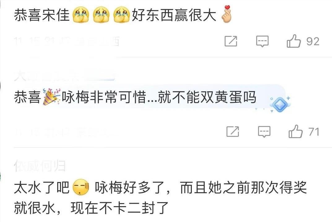 颁奖现场,咏梅坐在台下神情落寞的画面被截取传播,迅速激起广泛共情,“心疼咏梅”“她值得一座奖杯”等评论刷屏网络。