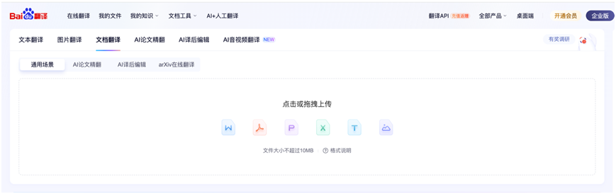 用户上传文档后,百度翻译支持多种格式的对照翻译,可在同一界面快速查看原文与译文,便于核对内容,确保信息完整。同时提供在线智能编辑,无需下载即可操作,并配备专业词汇提示和纠错功能。在翻译完成后,用户可自由选择 Word、PDF、PPT 等格式进行导出,便于后续保存、分享或编辑。除文档格式外,png、jpg、jpeg、bmp、tif 等常见图片格式也可一键翻译。